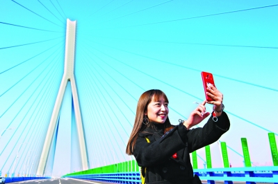沌口长江大桥开通前夕,市民在桥上体验并自拍记者任勇 摄